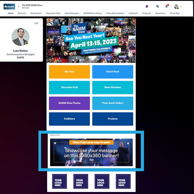 Include your message on a large banner prominently featured on the NAMM Show+ homepage and reach thousands of both in-person and online attendees.